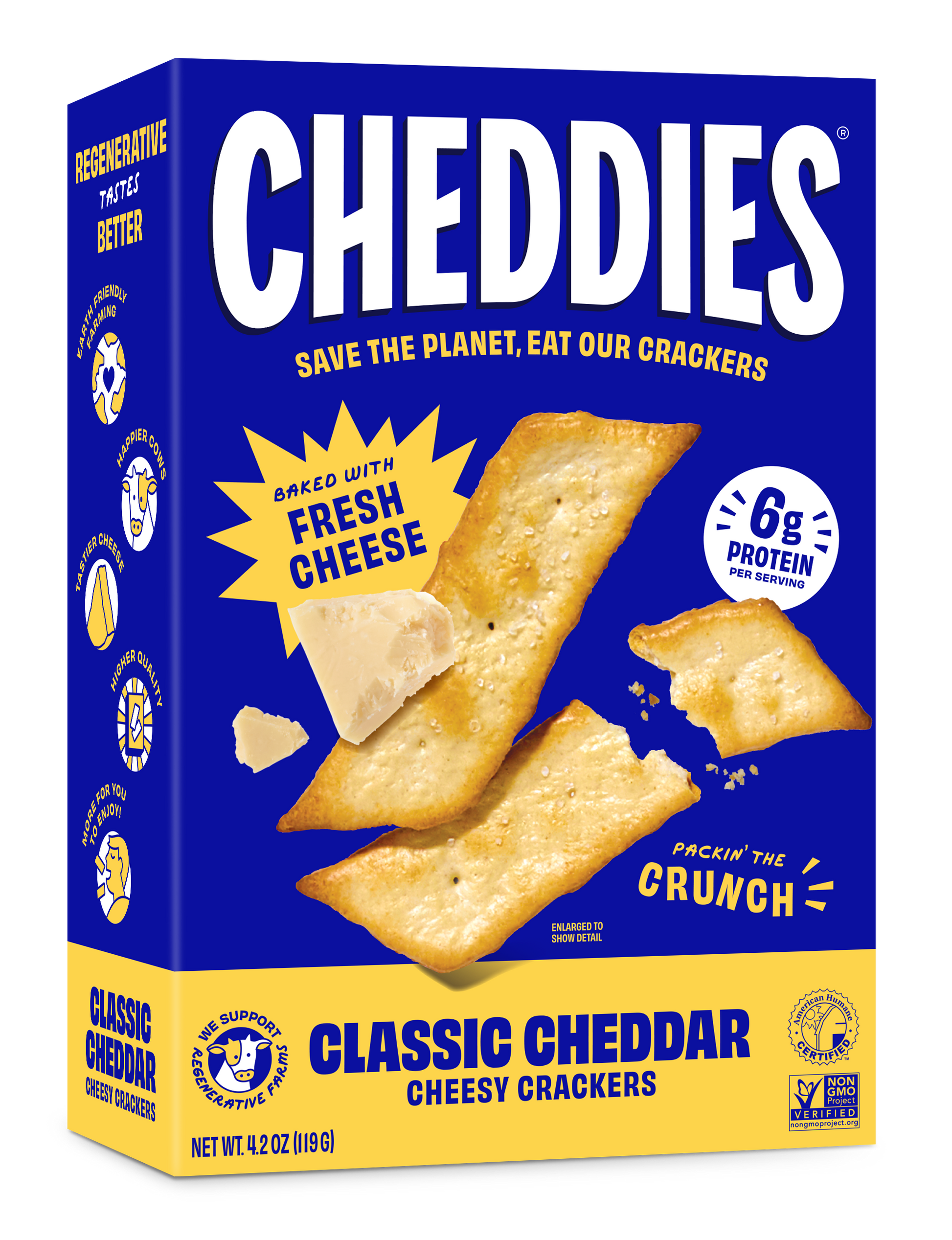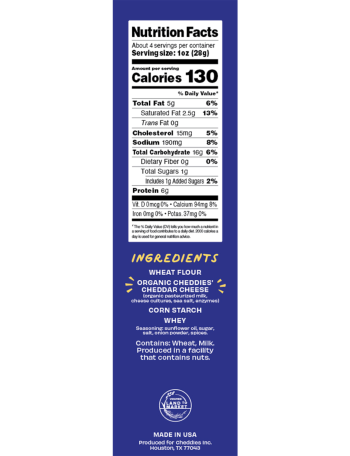 Indulge in Cheddies Classic Cheddar Cheesy Crackers, the ultimate cheesy delight made with premium aged cheddar cheese. Enjoy the rich, savory flavor you love with less carbs and 2x the protein, offering 6g per serving for a nutritious snack. Made with real cheese and simple ingredients, Cheddies are perfect for any snacking occasion, whether at home or on-the-go.